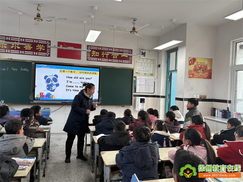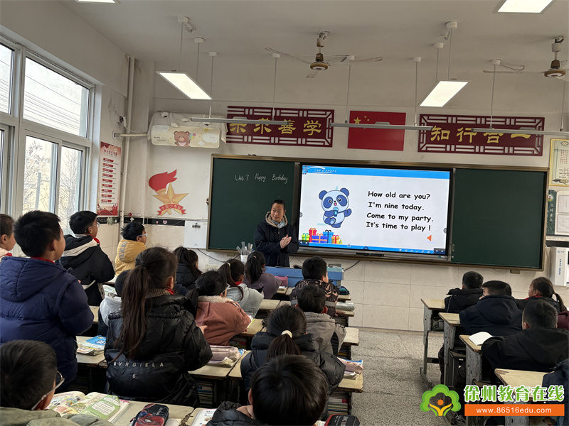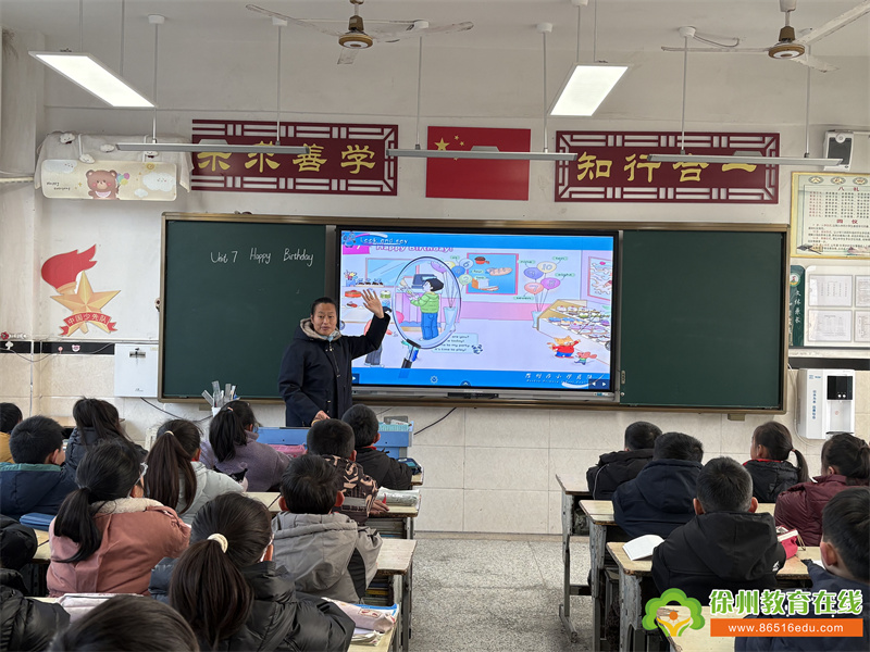 活动伊始,棠张镇实验小学老年教师赵艳红以"沉浸式生日派对"为核心情境,呈现了一堂生动鲜活的示范课。课堂伊始,李老师借助多媒体播放动画短片《波比的生日邀请》,瞬间将学生带入真实的交际场景,随后通过生日歌律动、数字拍手游戏激活旧知,自然衔接"one to ten"数字词汇复习。新知探究环节,她创新采用"分层任务驱动"模式:先通过动画片段分句跟读,帮助学生感知"What's this?" "How old are you?"等核心句型的语气与用法;再利用实物蛋糕、数字蜡烛、礼物盒等教具搭建互动支架,引导学生在"猜猜礼物""数一数蜡烛""送上祝福"等趣味活动中,实现词汇、句型与字母Uu、Vv、Ww发音的同步习得。