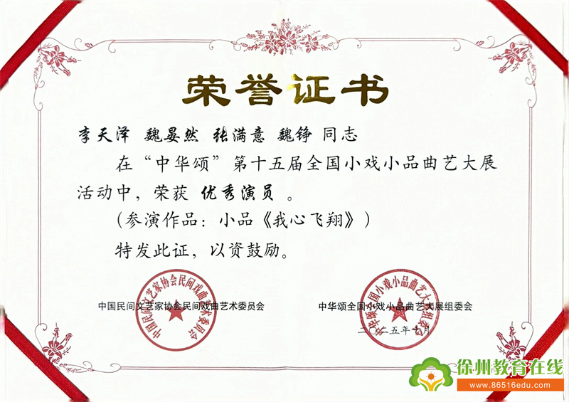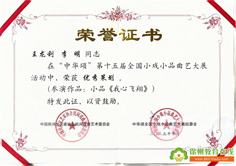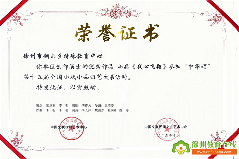 10月29日,“中华颂”第十五届全国小戏小品曲艺大展在北京丰台区文化馆圆满落幕。本次大展高手云集,汇聚全国众多专业院团、高校大学生艺术团的精品力作,竞争尤为激烈。铜山区特殊教育中心选送的校园剧《我心飞翔》凭借独特的创作视角、真挚的情感表达和扎实的舞台呈现脱颖而出,荣获“优秀剧目”奖项,以特教力量惊艳全国舞台,尽显我校特教艺术教育成果与师生风采。此次活动由任丽副书记带队,魏铮、张满意、孙胜男老师全程负责后勤及练习事宜。王龙利校长虽未亲赴京城赛场,却始终以牵挂为纽带,全程心系前线——从前期策划的方案研讨、排练打磨的细节叮嘱,到进京演出时的实时关切、后勤保障的远程统筹,每一个环节都浸润着他的责任与期许,更凝聚着全体铜山特教人的热忱与坚守。