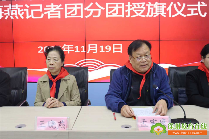 小海燕记者团总部主任陈晓讲话说:今天徐州市关工委在这里隆重举行第四批小海燕记者团分团学校授旗仪式,铜山区又有3个分团学校加入小海燕记者团,我们表示欢迎祝贺。小海燕记者团成立25多年来,开展了丰富多彩的社会实践活动,举办了上百个冬夏令营及大型采访活动,足迹遍及大江南北,途径20余省市,行程十万余公里,受到了从中央到地方各级领导的接见。为国家培养了大量的人才,受到社会广泛欢迎。希望小海燕记者团各分团秉承“在快乐中学习,在实践中成长,在创新中飞翔”的办团理念,充分利用当地资源,走出学校,奔向社会大课堂,开展丰富多彩的社会实践活动,在活动中经风雨、见世面、增知识、长才干;希望小记者们深入社会,观察社会,了解社会,宣传社会,让每一位小记者在社会大课堂的广阔天地里,展翅搏击风雨,迎接时代大潮。