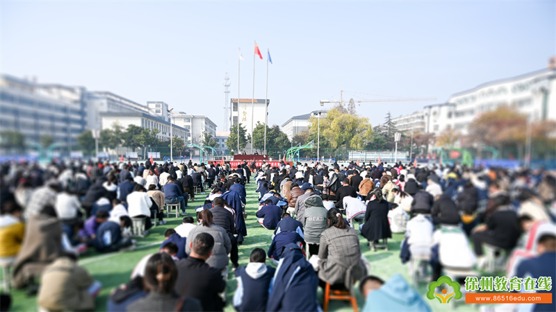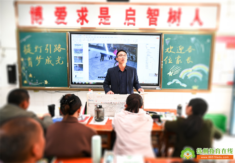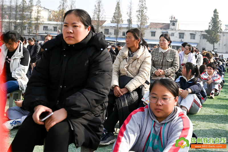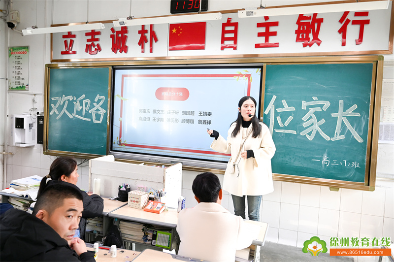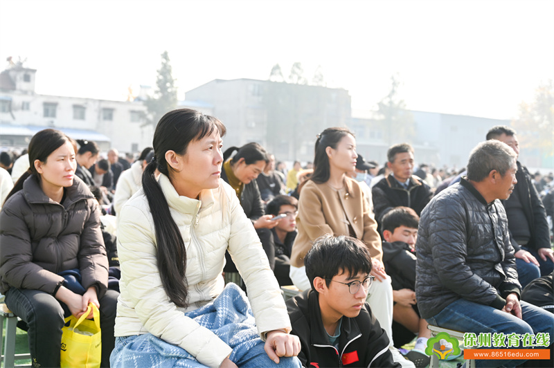 会议分为两部分。第一部分在操场举行。会上,高三年级部主任张强介绍开学至今全体师生们的辛勤付出,并向家长们汇报我校在本次徐州市统一测试摸底考试中取得的优异成绩。