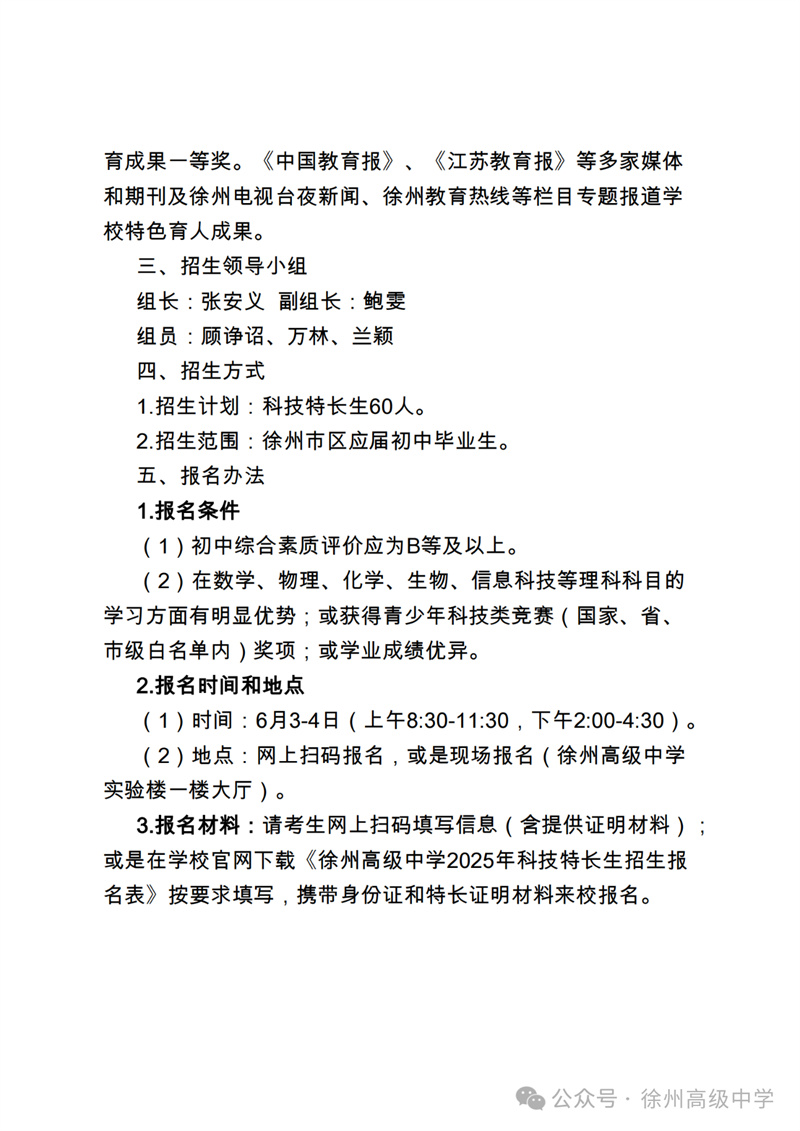 2025徐州高级中学科技特长生招生简章