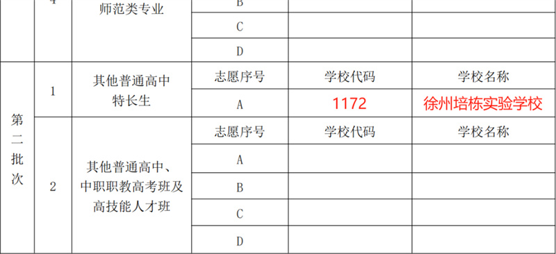 (2)志愿填报:“其他普通高中特长生”栏;学校代码:1172;学校名称:徐州培栋实验学校。
