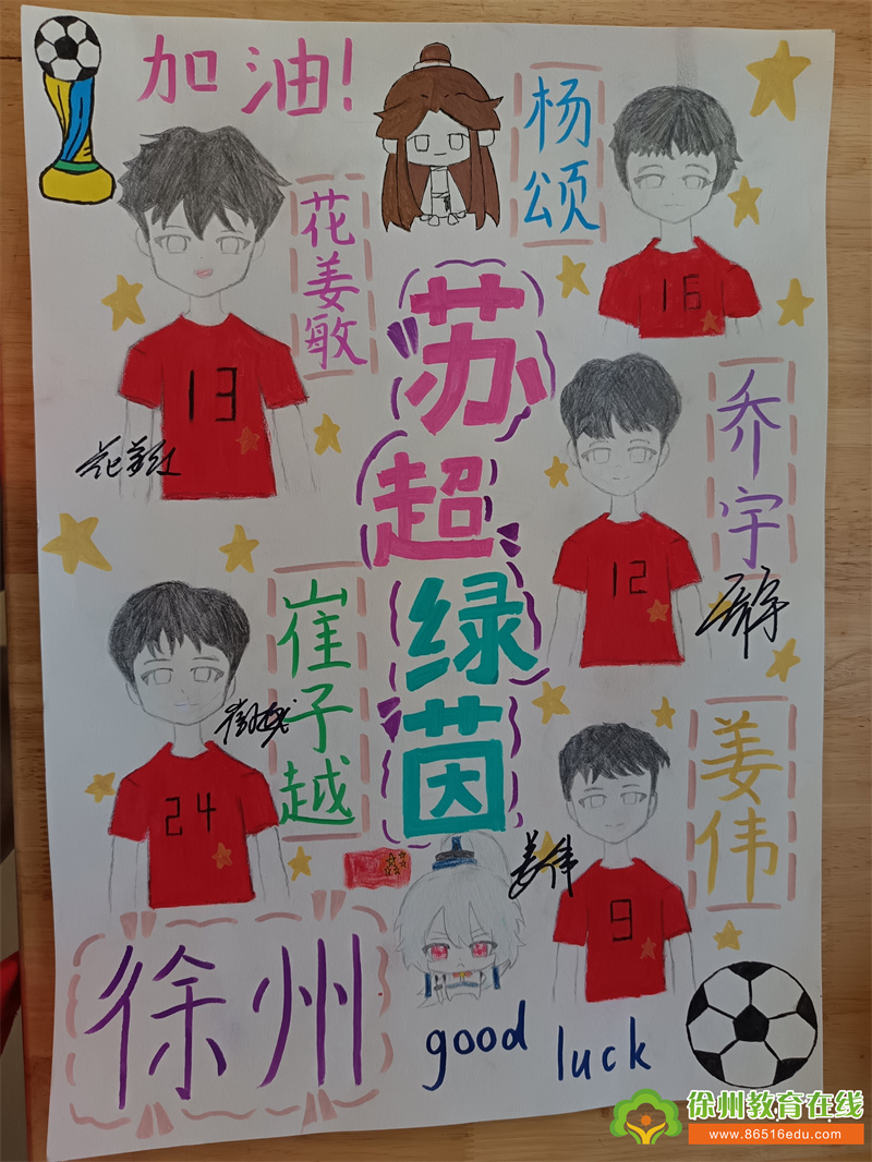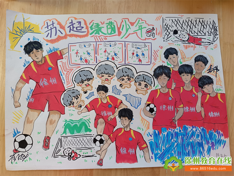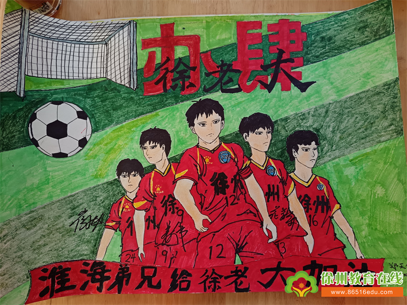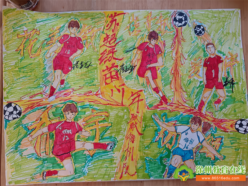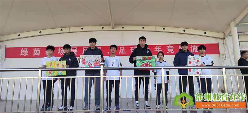 活动伊始,参训教师们首先观摩了郑集镇中心中学、铜山区郑集实验小学的大课间特色活动——郑集实验小学五年级学生带来的篮球操活力十足,整齐的动作、饱满的精神,展现了校园体育的蓬勃生机;随后,师生们与苏超足球明星开启互动环节:学生们将亲手绘制的足球主题绘画作品赠予球星,色彩斑斓的画作里满是对足球的热爱;紧接着,校足球队员与苏超球星展开了一场趣味足球友谊赛,绿茵场上奔跑、传球、射门的身影,让现场洋溢着青春与竞技的活力;比赛结束后,球星们为师生签名留念,定格下这场足球交流的温暖瞬间。