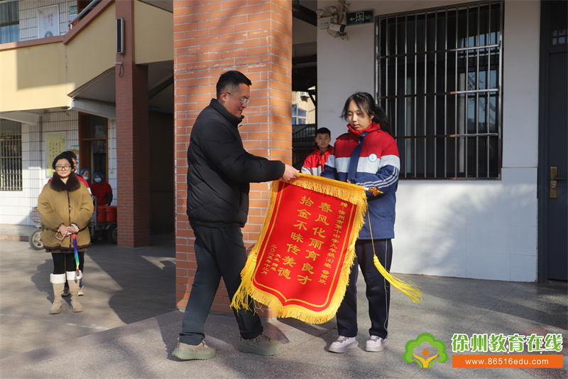 苏公网安备 32031102000486号2025年12月15日上午,徐州市第十中学党支部副书记杜黎明将一面印着“春风化雨育良才,拾金不昧传美德”的红色锦旗,送到了九年级(4)班学生昝雨欣的手中。送锦旗的市民以此感谢昝雨欣帮他找回遗失的重要物品。