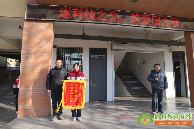 徐州十中始终将“立德树人”作为教育根本,通过系统化、多样化的举措,将品德培养融入校园生活方方面面,引导学生在成长中明事理、修品德、担责任。严寒冬日里,昝雨欣同学拾金不昧的行为,不仅展现了当代中学生诚实守信的优良品质,更成为严寒冬日里的“暖心榜样”。德育处徐烽久老师在周一升旗仪式上对其公开表扬,并号召全体同学以她为榜样,将美德融入日常,传递青春正能量。