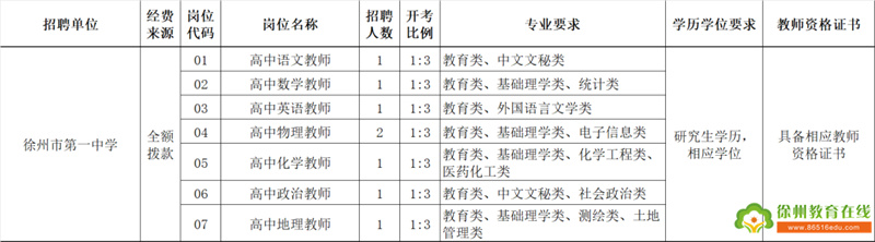 高中语文:1人;高中数学:1人;高中英语:1人;高中物理:2人;高中化学:1人;高中政治:1人;高中地理1人。(详见《徐州市第一中学2025年公开招聘教师岗位信息表》)