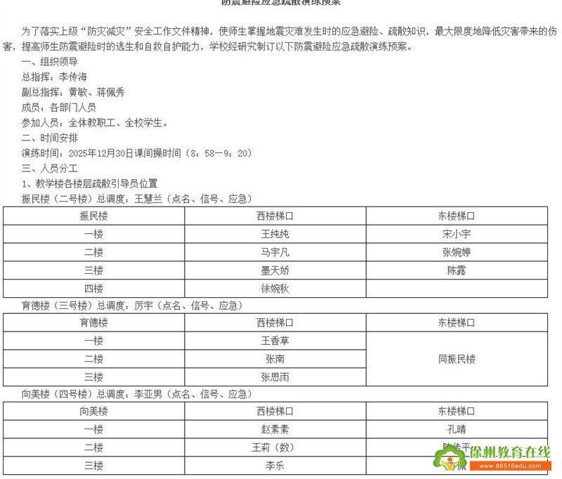 苏公网安备 32031102000486号为进一步强化全校师生的防震减灾意识和应急避险能力,切实保障师生生命安全,根据上级部门关于校园安全工作的部署要求,徐州市振兴路小学于2025年12月30日成功组织开展了防震减灾应急疏散演练。本次演练严格遵循“安全第一、预防为主、综合治理”的原则,通过模拟真实地震场景,检验了学校应急预案的科学性和可操作性,提升了师生协同应对突发事件的实战能力。现将本次演练情况总结如下: