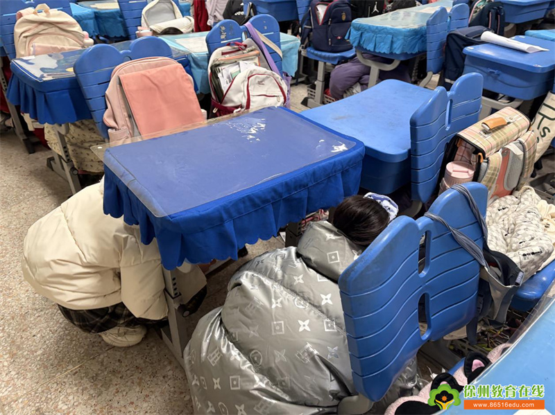 第一阶段为应急避震。上午12月30日,演练信号(急促警报声)准时响起,各班级班主任立即组织学生采取应急避震措施:学生迅速双手抱头,躲在课桌下方,尽量蜷缩身体,降低重心,用课本、书包等保护头部和颈部,远离窗户、吊灯等危险物品。各楼层引导员迅速到位,查看各班级避震情况,及时纠正不规范动作,确保避震环节安全有序。整个避震阶段持续1分钟,师生反应迅速、动作规范,达到了预期避震效果